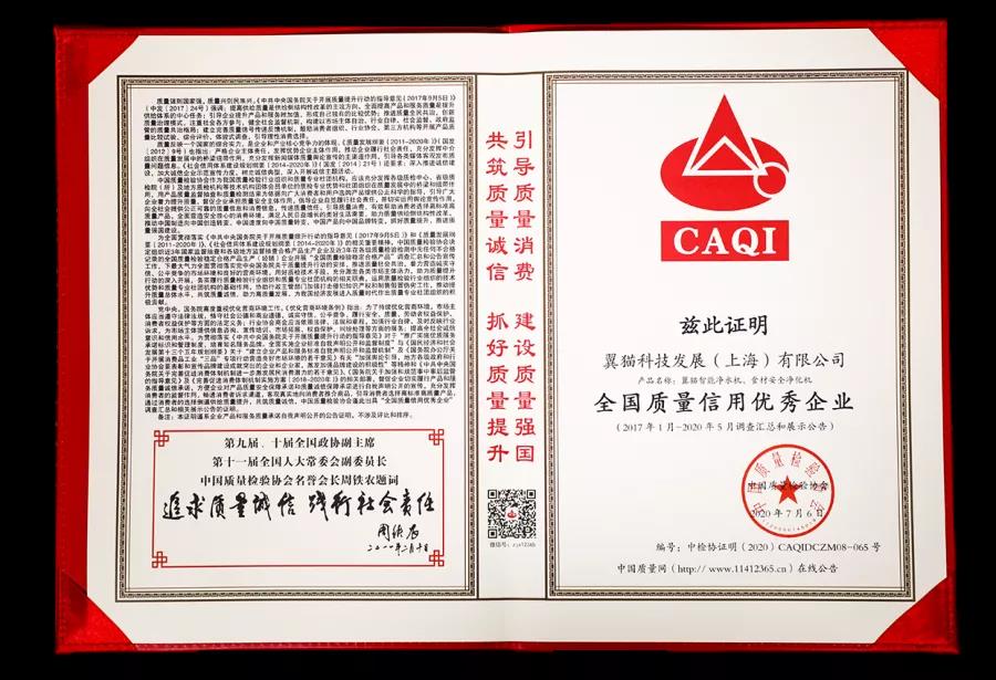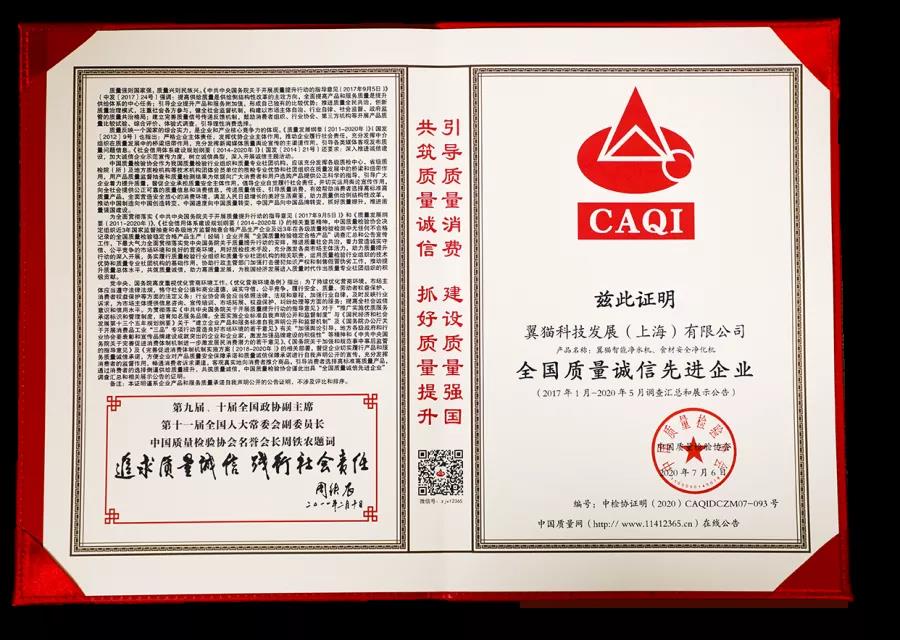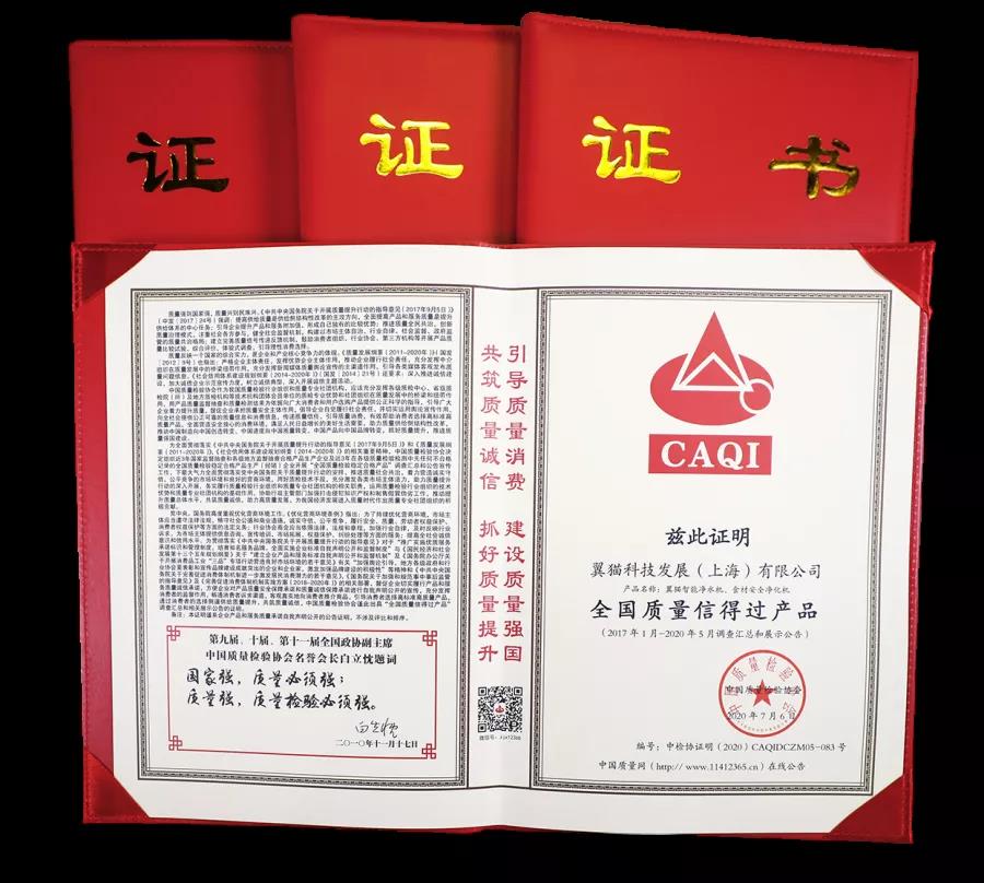 During the same period, in the integrity commitment of product and service quality on March 15, 2020, The Smart water purifier and food material safety purifier were awarded the honorary title of "National Model Enterprise of Integrity of Product and service Quality" and "National Stable and qualified Product of Quality inspection" by China Quality Inspection Association.