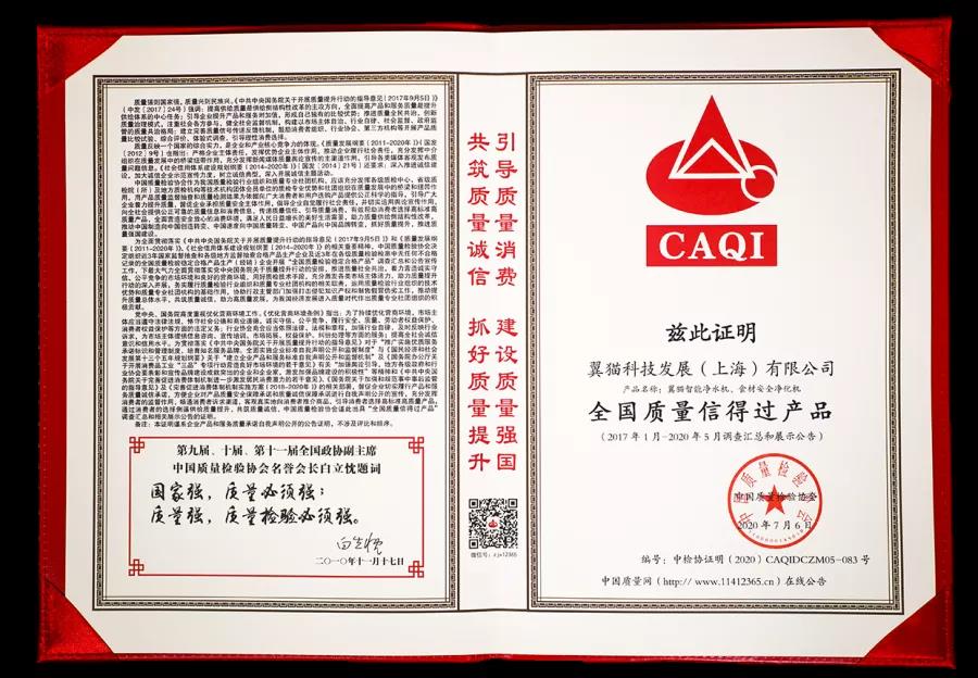 Warm congratulations on the Yimao technology development (Shanghai) co., LTD. (Yimao intelligent water purification machine, food safety purification), the China quality inspection association in 2017-2020 annual stable "national quality inspection qualified product" survey and show announcement, once again won the "credibility of the quality guarantee product" "national quality integrity advanced enterprise" "the national quality credit outstanding enterprise" "the national quality trustworthy product" four honor.